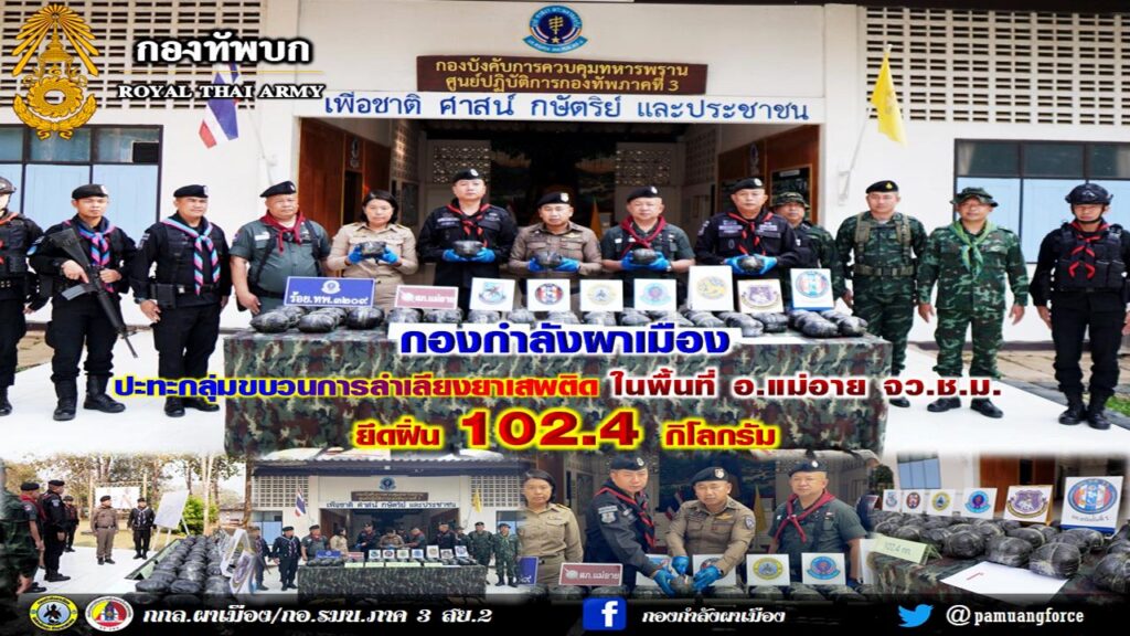 กองกำลังผาเมือง ปะทะกับกลุ่มขบวนการลักลอบลำเลียงยาเสพติด ยึดฝิ่น 102.4 กิโลกรัม ในพื้นที่ อำเภอแม่อา...