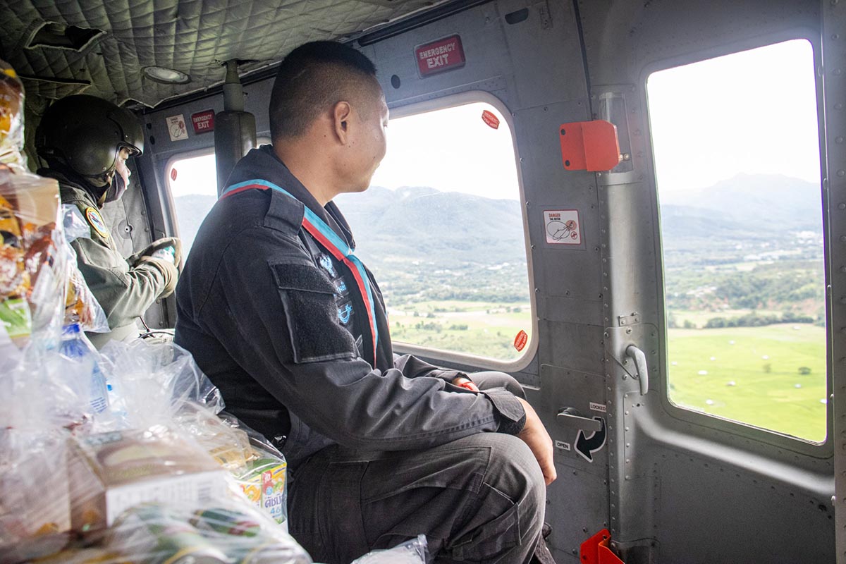 โดย เฮลิคอปเตอร์ ได้ นำสิ่งของยกตัว จาก กรมทหารพรานที่ 36 ลำเลียงถุงยังชีพจำนวน 30 ชุด พร้อมน้ำดื่ม 100 แพ็ค ที่ได้รับการสนับสนุนจาก องค์การบริหารส่วนตำบลแม่คง ขนส่งทางอากาศเข้าพื้นที่ บ้านห้วยแห้ง ทั้งนี้ภารกิจครั้งนี้มีความจำเป็นเร่งด่วน เนื่องจากเกิดเหตุดินสไลด์ปิดเส้นทางเข้าออกหมู่บ้าน ทำให้ราษฎรไม่สามารถเดินทางออกมารับความช่วยเหลือได้ การขนส่งทางอากาศจึงเป็นทางเลือกสำคัญ เพื่อให้สิ่งของจำเป็นถึงมือผู้ประสบภัยอย่างทันท่วงที