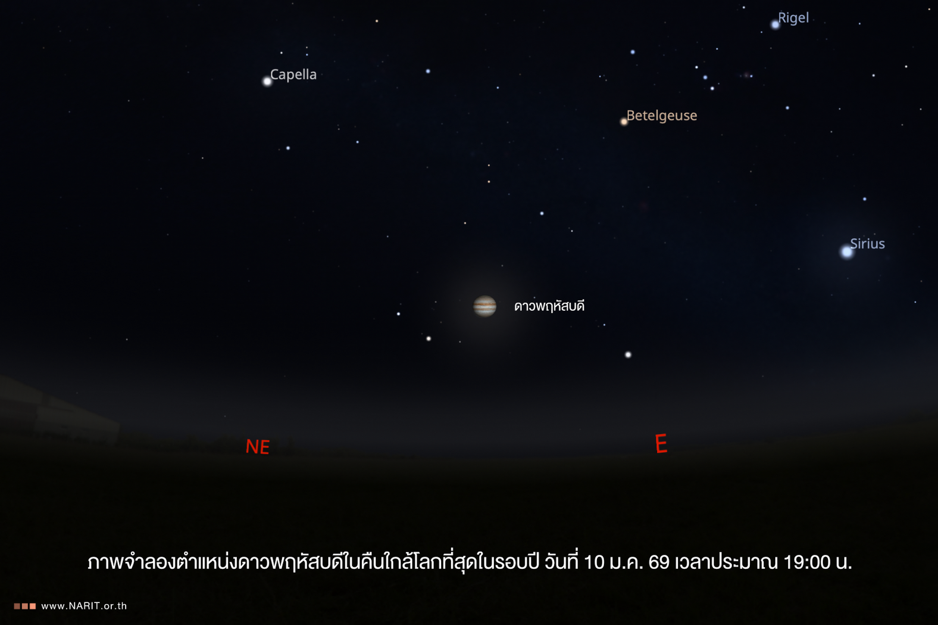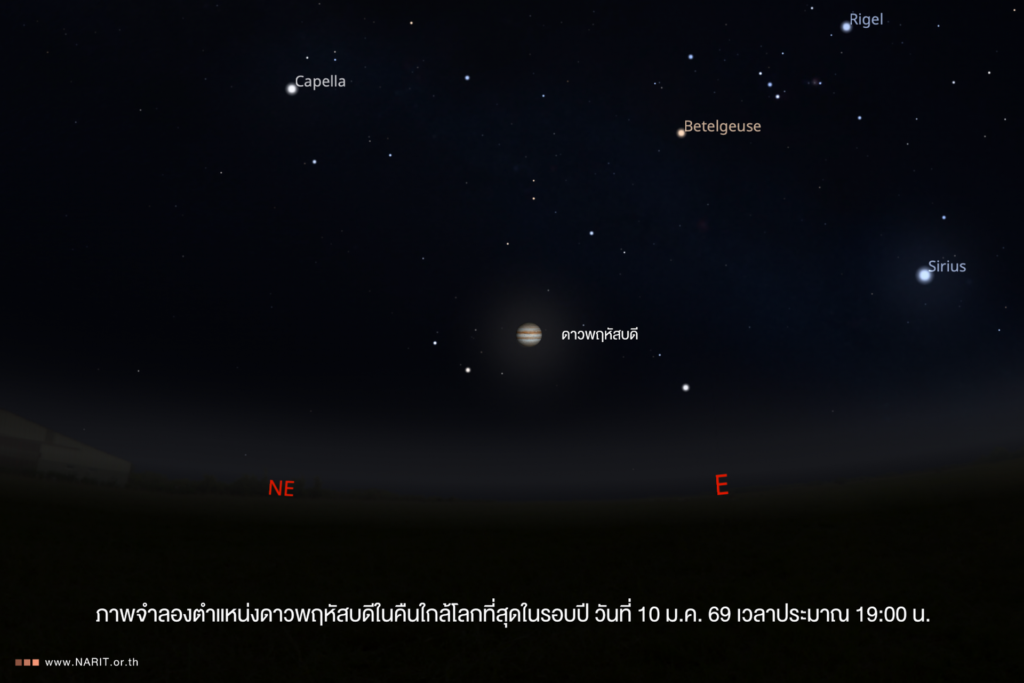 นายศุภฤกษ์ คฤหานนท์ ผู้ช่วยผู้อำนวยการ สดร. เปิดเผยว่า วันที่ 10 มกราคม 2569 ซึ่งตรงกับวันเด็กแห่งชาติ ดาวพฤหัสบดีจะโคจรมาอยู่ในตำแหน่งตรงข้ามดวงอาทิตย์ (Jupiter Opposition) หมายถึง ตำแหน่งที่ดวงอาทิตย์ โลก และดาวพฤหัสบดี เรียงอยู่ในแนวเส้นตรงเดียวกัน มีโลกอยู่ตรงกลาง ส่งผลให้ดาวพฤหัสบดีอยู่ในตำแหน่งใกล้โลกที่สุดในรอบปี ห่างจากโลกประมาณ 633 ล้านกิโลเมตร ในวันดังกล่าว เมื่อดวงอาทิตย์ลับขอบฟ้า ดาวพฤหัสบดีจะปรากฏสว่างทางทิศตะวันออก สังเกตได้ด้วยตาเปล่า นานตลอดคืนจนถึงรุ่งเช้า หากมองผ่านกล้องโทรทรรศน์ ขนาดเส้นผ่านศูนย์กลาง 4 นิ้ว ที่มีกำลังขยายตั้งแต่ 30 เท่าขึ้นไป จะสามารถสังเกตเห็น “ดวงจันทร์กาลิเลียน” ทั้ง 4 ดวง ได้แก่ ไอโอ ยูโรปา แกนีมีด คัลลิสโต รวมถึง “แถบเมฆ” ที่สวยงามของดาวพฤหัสบดี และหากใช้กำลังขยาย 100 เท่าขึ้นไป จะสามารถเห็น “จุดแดงใหญ่” พายุหมุนยักษ์ที่มีขนาดใหญ่กว่าโลกถึง 1.3 เท่า ได้อย่างชัดเจน