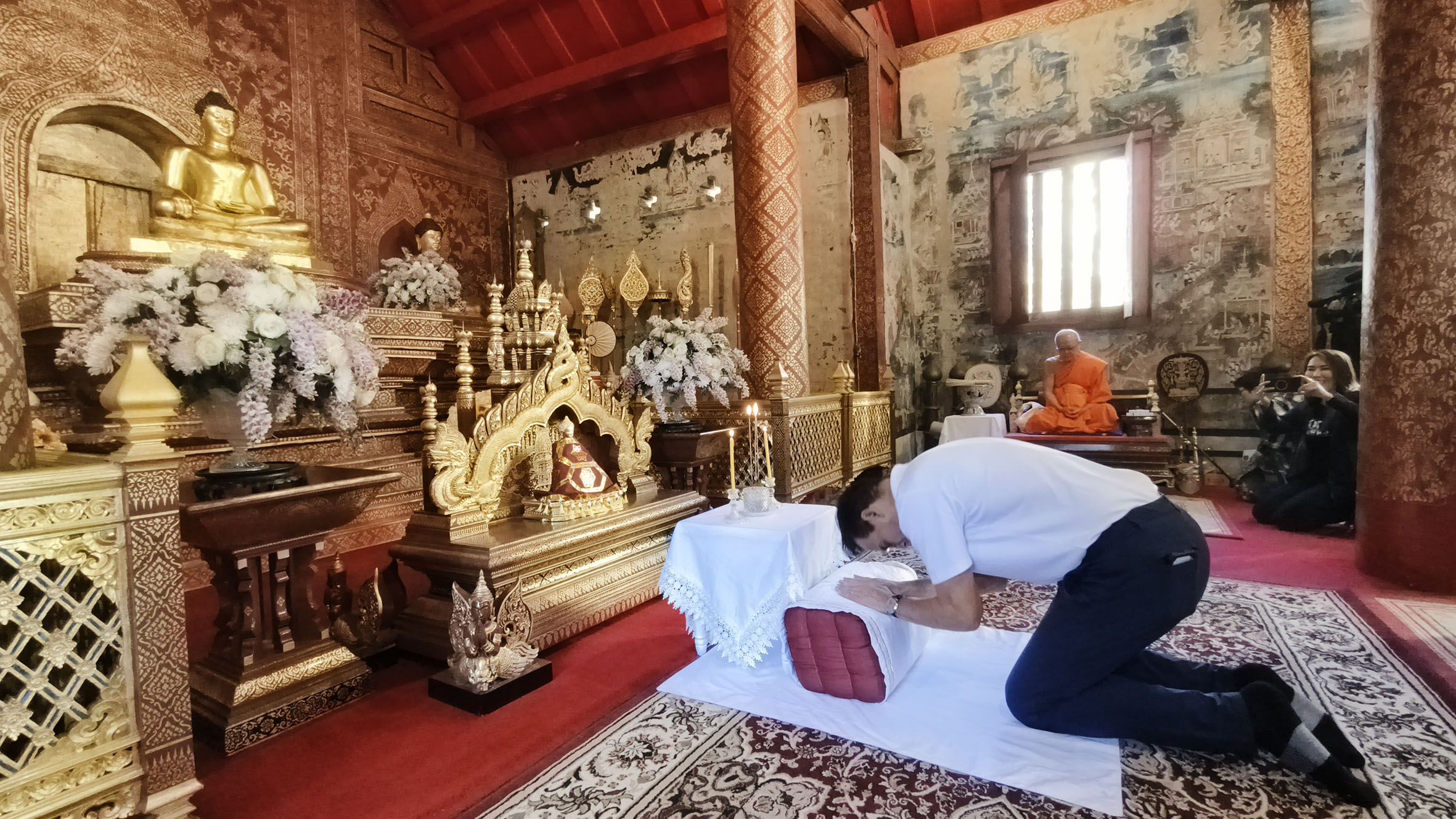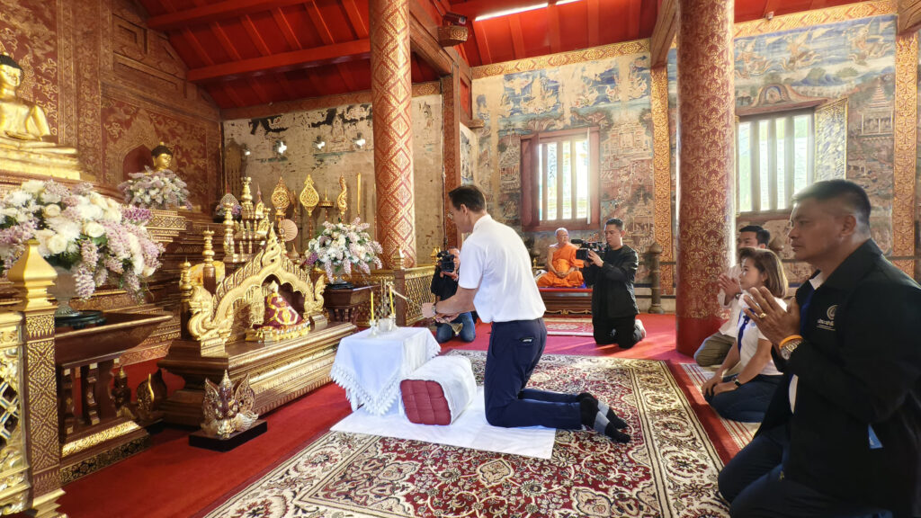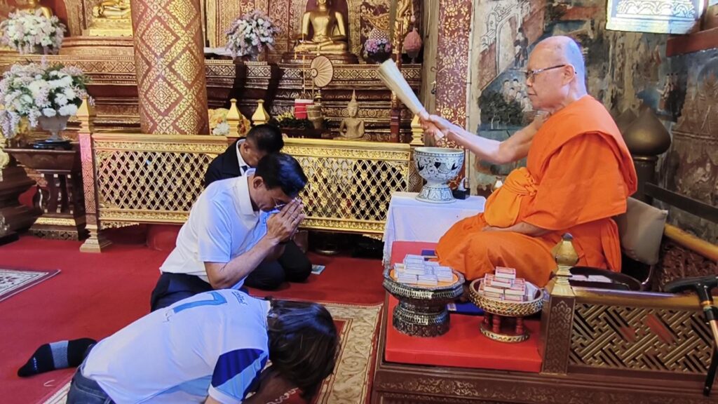 โดยนายกรณ์ พร้อมผู้สมัคร ได้เขากราบไหว้ พระครูวิธานวรกิจ ผู้ช่วยเจ้าอาวาสวัดพระสิงห์ เพื่อขอพรและปะพรมน้ำมนต์ และได้รับวัตถุมงคล เป็นพระยอดขุนพล ที่สร้างจากกระเบื้องหลังคาพระวิหารลายคำ ซึ่งปัจจุบันอยู่ช่วงระหว่างการบูรณะและนำกระเบื้องเก่ามาทำเป็นวัตถุมงคล ก่อนจะเดินกราบไหว้พระภายในวัด